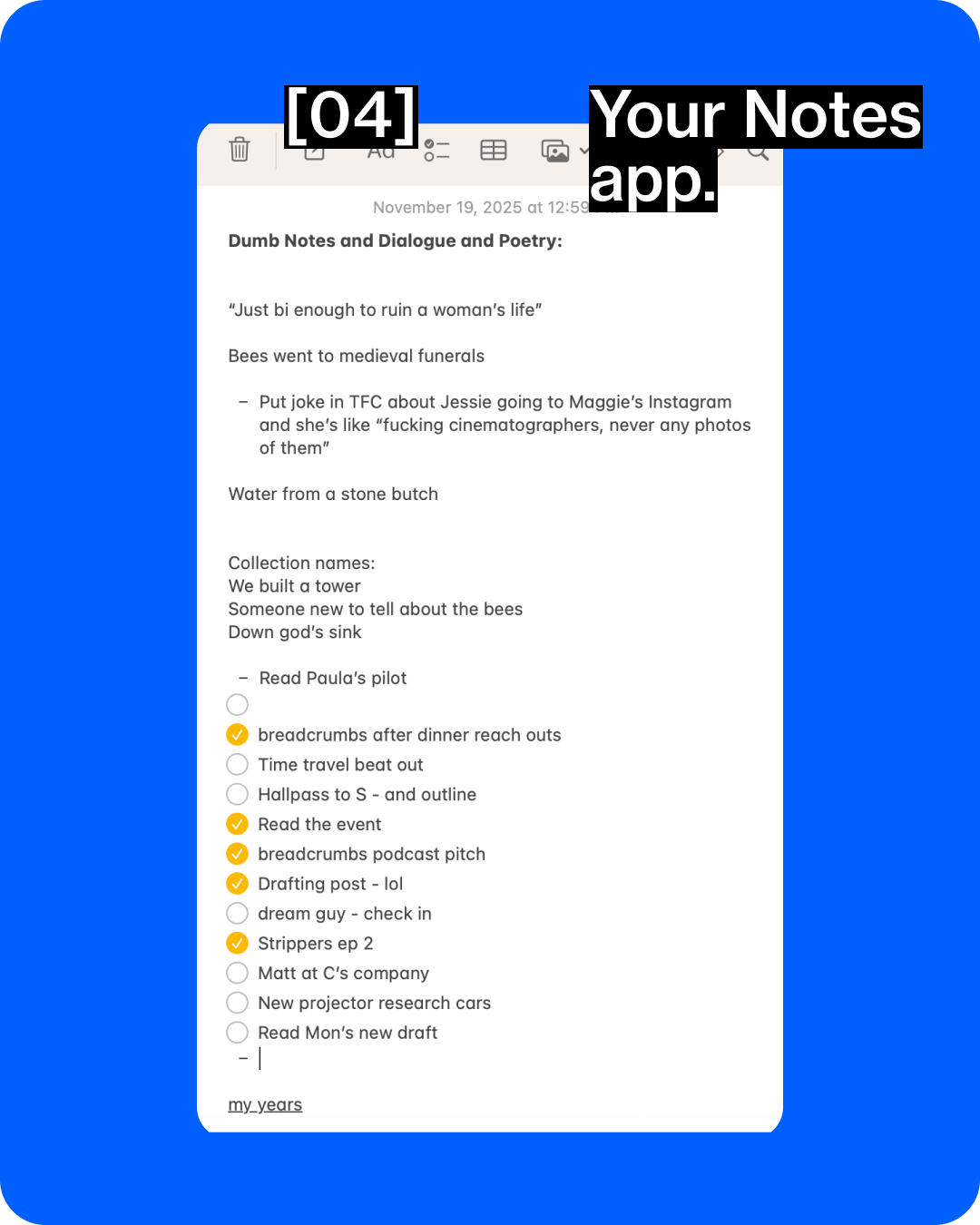 This is from my Notes app (AKA my brain). Since doing The Artist’s Way, I have been writing a lot of weird gay poetry and some potential titles for a collection of my poems are included in this specific “To Do” note. Please vote on them.