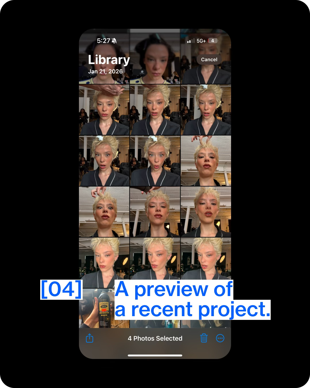 As NYFW begins, we asked the model to unlock her phone for DRAFTING. She shared glimpses into her private and professional worlds, from old college voice recordings and selfies from a recent shoot that called for many wigs.