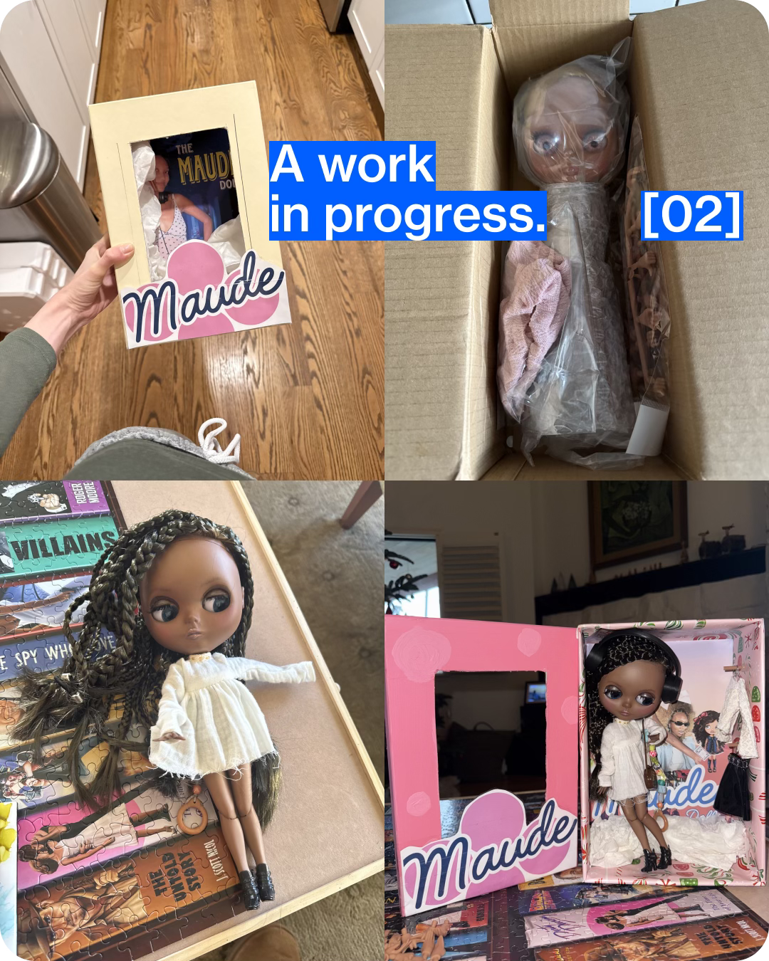 WIP pics of the custom Blythe doll I made for my childhood bestie Maude. She’s obsessed with them, so I bought a factory doll from AliExpress, sculpted the face, painted the skin, did her makeup and braids, sourced her outfits, and made her a little box. New hobby and craft unlocked.