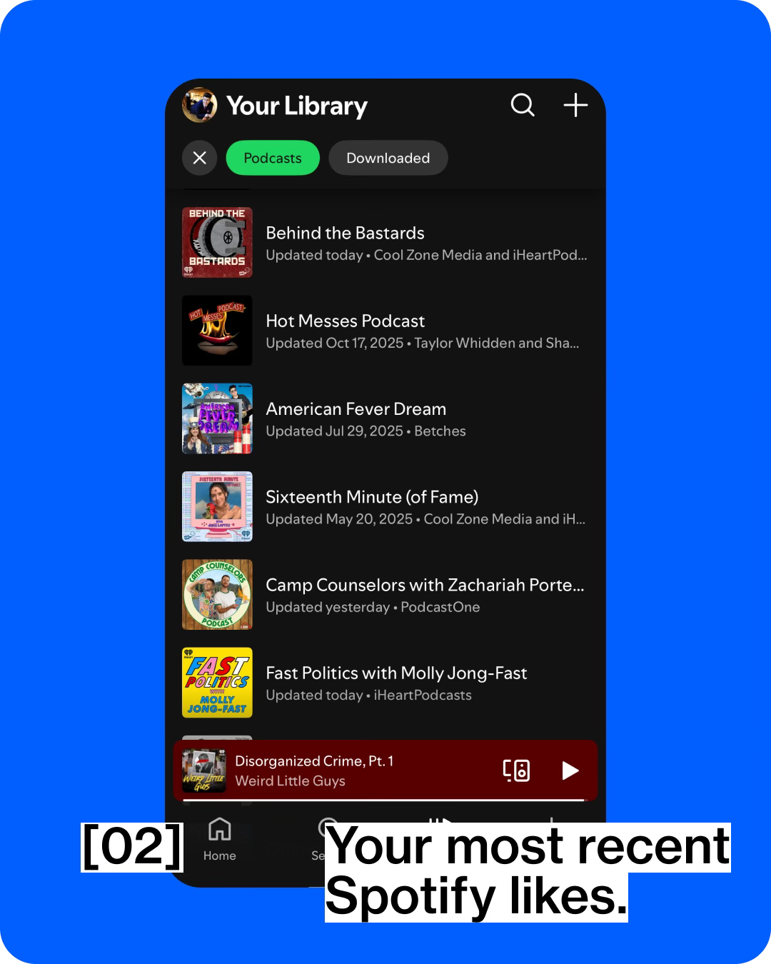 I don't have any liked songs because podcasts are what I use Spotify for. Politics and history are both how I make my living, and how I spend my leisure time. Even the comedy podcasts I subscribe to are news and political commentary shows. Why am I like this?